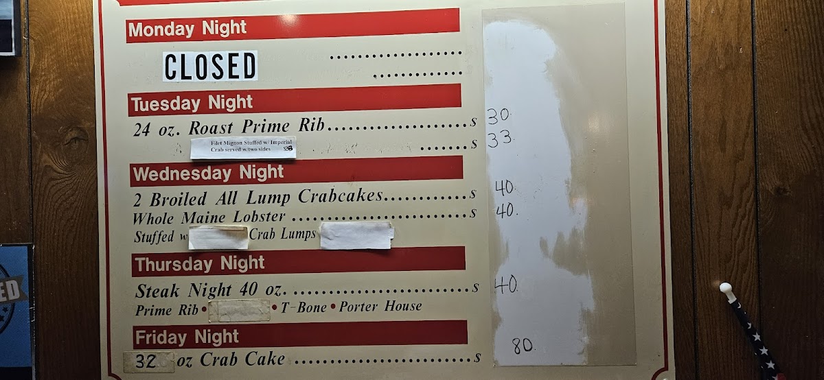 Start with approachable appetizers like crab-stuffed pretzels or mozzarella sticks, perfect for sharing and setting the tone for a relaxed meal. Main courses highlight generous cuts of steak such as the 40oz Porterhouse and prime rib, alongside seafood staples like jumbo lump crab cakes, stuffed flounder, and lobster paired with crab imperial. These plates often come with traditional accompaniments like baked potatoes or steak fries, reinforcing the no-fuss, satisfying dining experience.